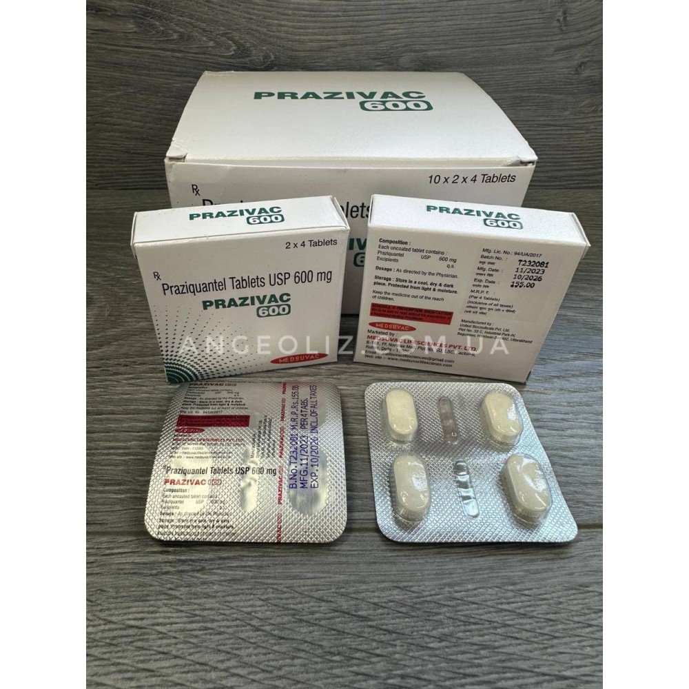 Празиквантел 600 мг (Prazivac) — високоефективний протигельмінтний засіб широкого спектра дії, який є повним аналогом препарату Більтрицид. Засіб є похідним хіноліну. Його антигельмінтна дія зумовлена порушенням проникності клітинних мембран гельмінтів для іонів кальцію. Цей процес призводить до швидкої паралізації паразитів та руйнування їх клітинних оболонок. Завдяки пригніченню метаболізму глюкози паразити гинуть.